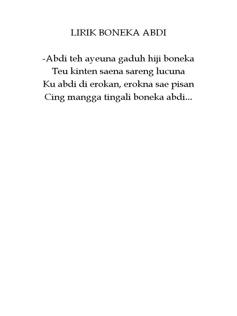 Abdi teh ayeuna gaduh hiji boneka teu kinten saena sareng lucuna ku abdi dierokan erokna sae pisan cing mangga tingali boneka abdi lirik bahasa indonesia saya sekarang punya sebuah boneka tak terkira bagus dan lucu saya pakaikan rok roknya pun bagus ayo silahkan lihat boneka saya. Sansan simpey 282 955 views.